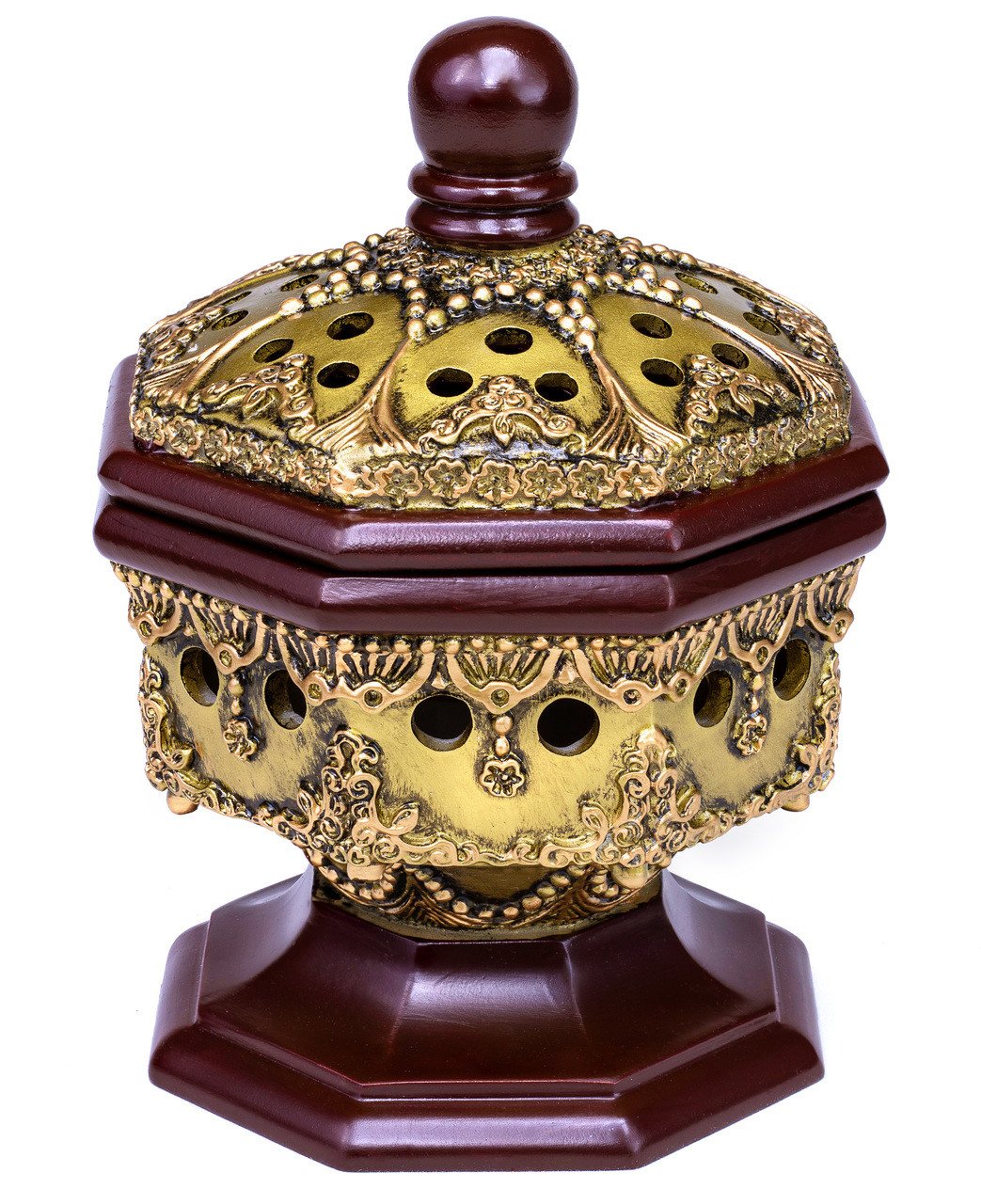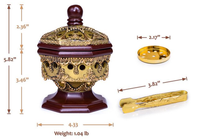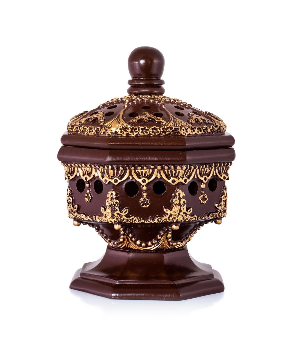 Elegant and beautiful, this luxury octagon incense burner will add grandeur to your home decor. It comes in a choice of two stunning colors: bronze and brown embellished with hand painted golden accents. Use charcoal (purchased separately) to burn your favorite incense. The burner may be used to burn incense with or without lid.